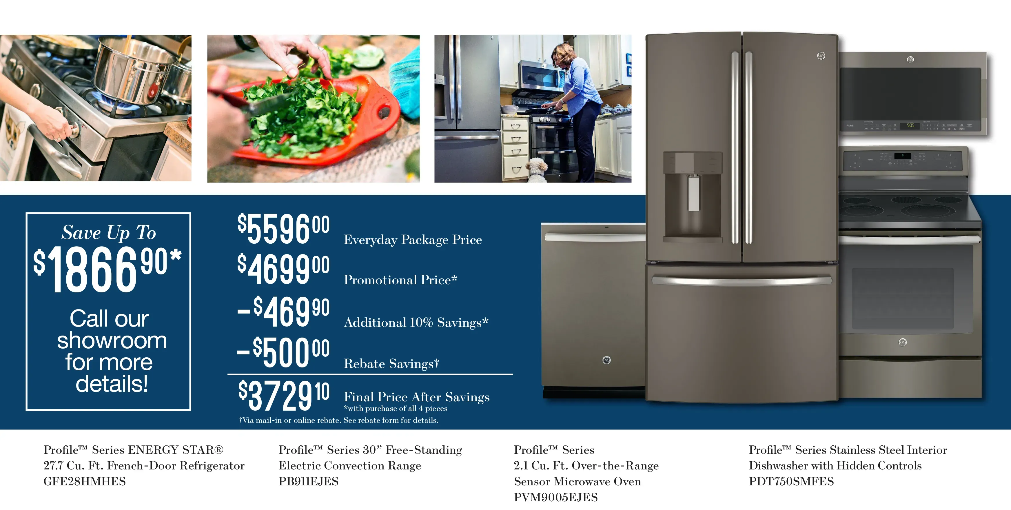 You can save up to $1,500 on select appliance packages from eligible GE Profile Series and GE Appliance sets. The idea is simple: the more you buy, the more you save. For example when you buy 2 appliances, you get $100 mail-in rebate but when you buy 8 appliances, you get $1,500 mail-in rebate.